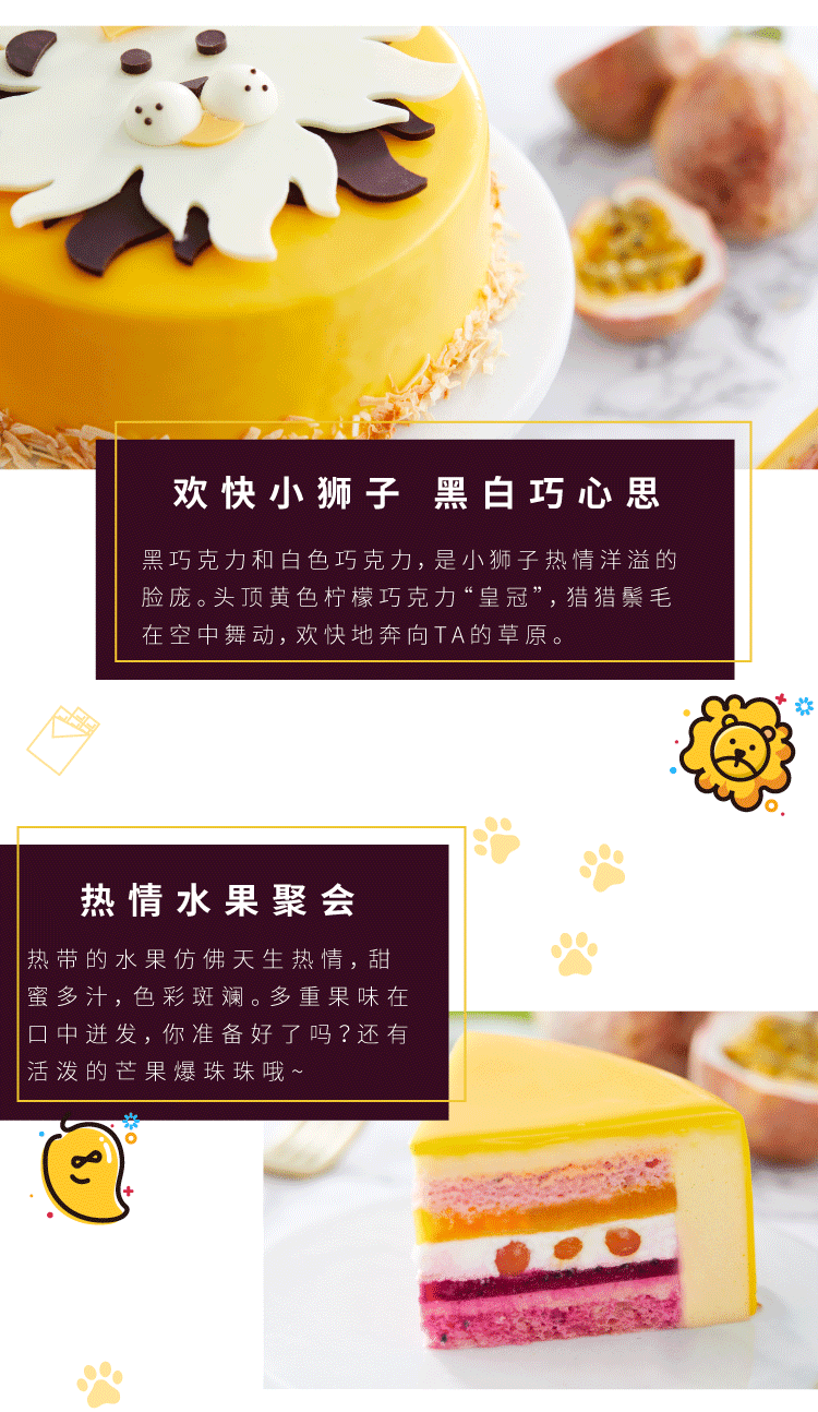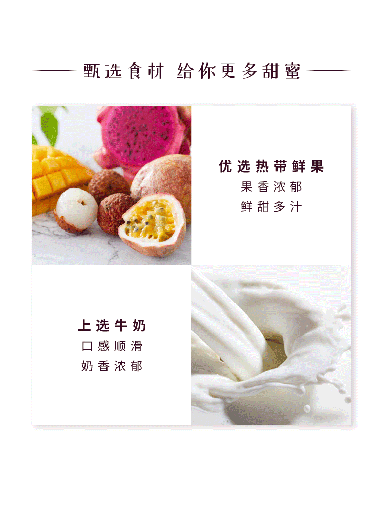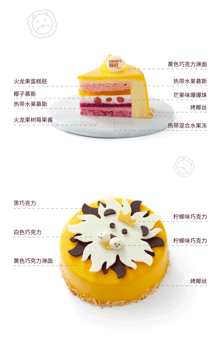 酸甜清爽,热带风味双重慕斯结合,引入火龙果的元素,芒果味的爆浆感,好吃好玩,口感顺滑。