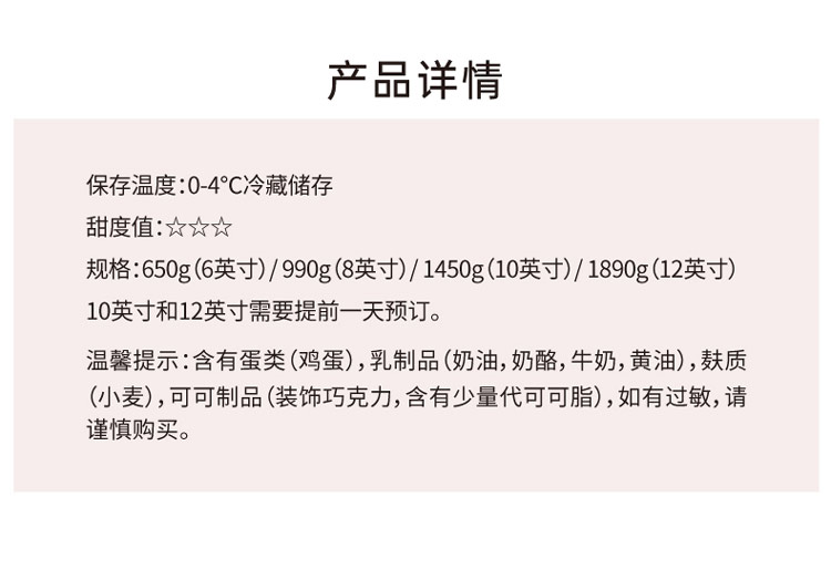 过敏原:含有蛋类(鸡蛋),乳制品(奶油,奶酪,牛奶,黄油),麸质(小麦)。 提示:本产品含有可可制品(装饰巧克力),其中装饰用巧克力制品含有少量代可可脂;纸质Logo插牌不可 食用;