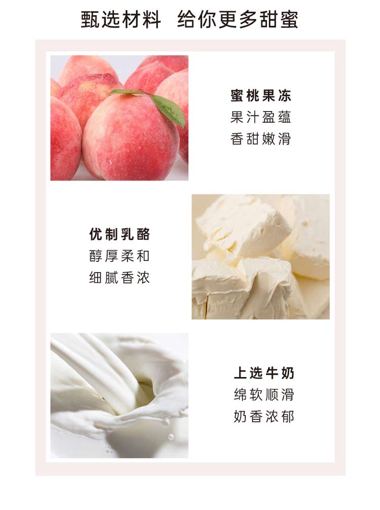 精选进口蜜桃果蓉、自然清新蜜桃香缇奶油、醇香细腻冻芝士布丁、晶莹软糯蜜桃果冻,清甜桃 味,趣味横生。