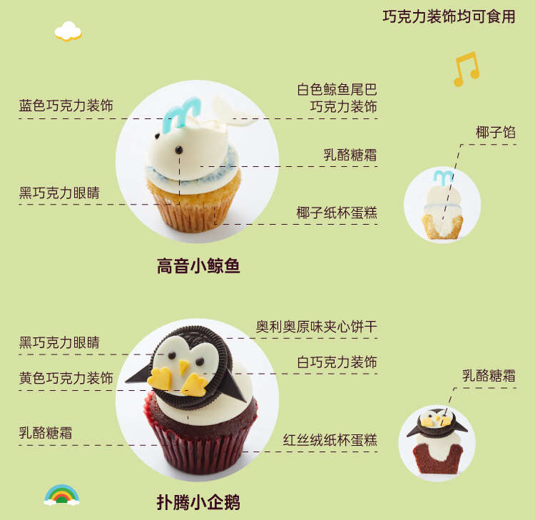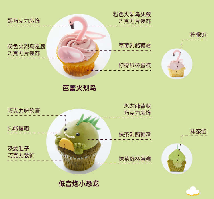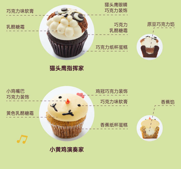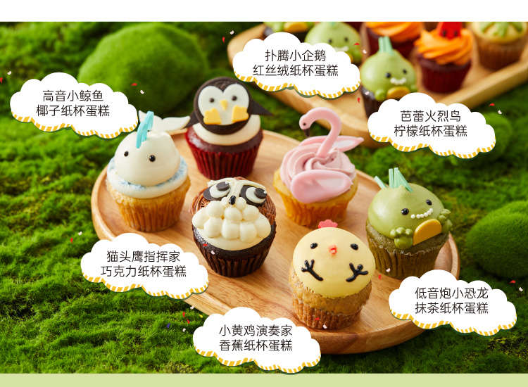 多重口味的纸杯蛋糕和特制馅料,经典的乳酪糖霜,卡通可爱的动物形状巧克力插片,醇正的口味,巧妙的融合。