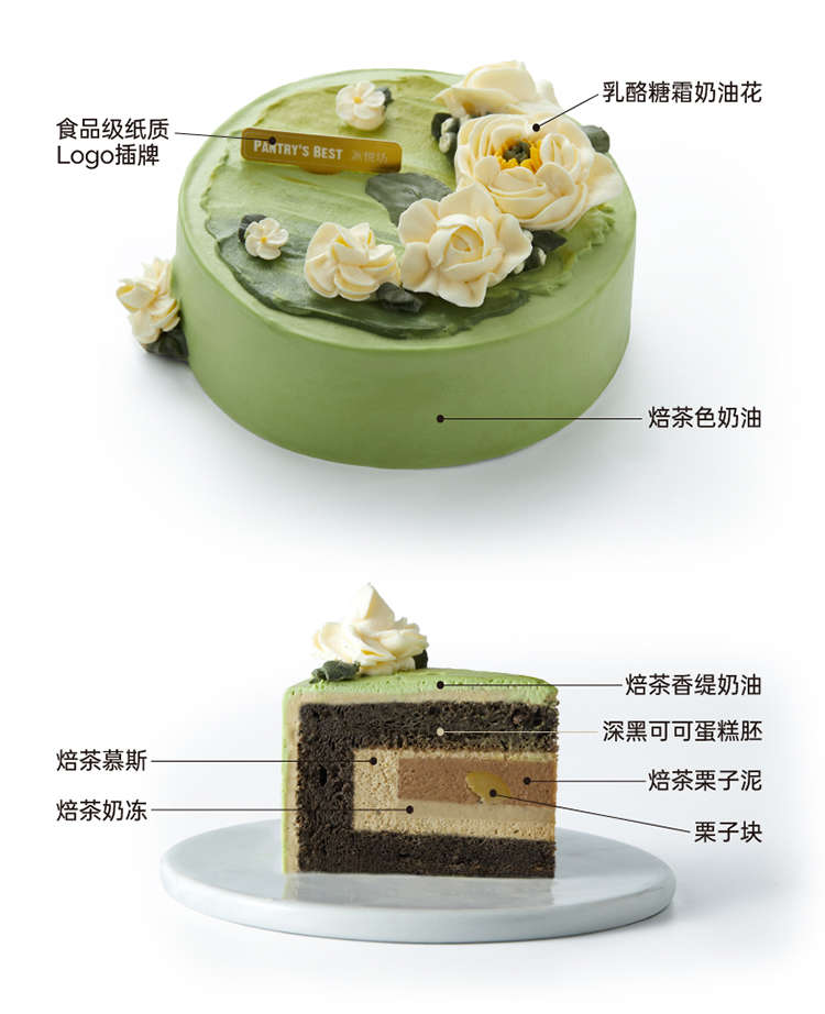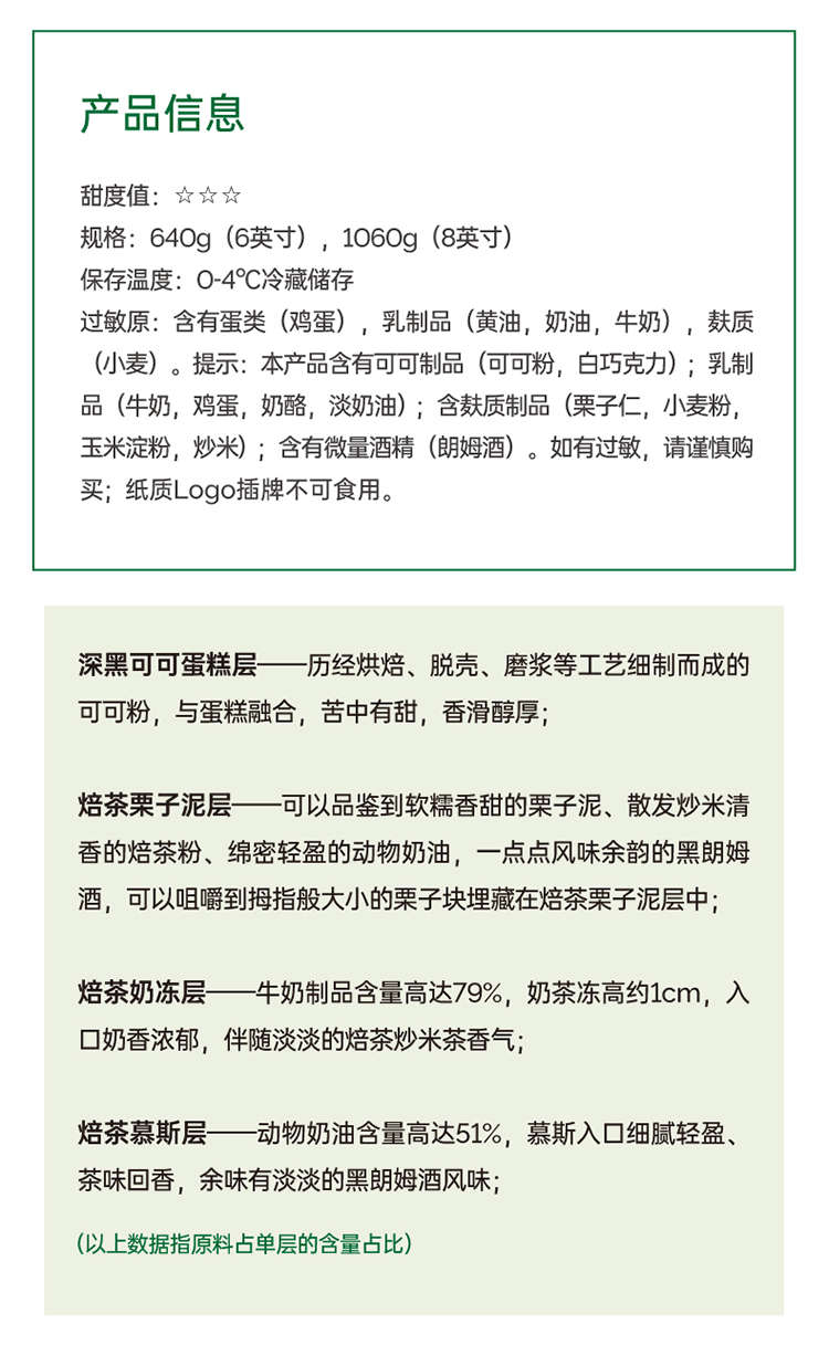 甄选宇治高档焙茶粉,制成独特口味的焙茶香缇奶油,焙茶慕斯和焙茶奶冻,并与焙茶栗子泥完美结合,绵软的深黑可可 戚风蛋糕胚,带来双重口感的的极致味蕾体验,甄选好料,口味醇正,层次丰富。