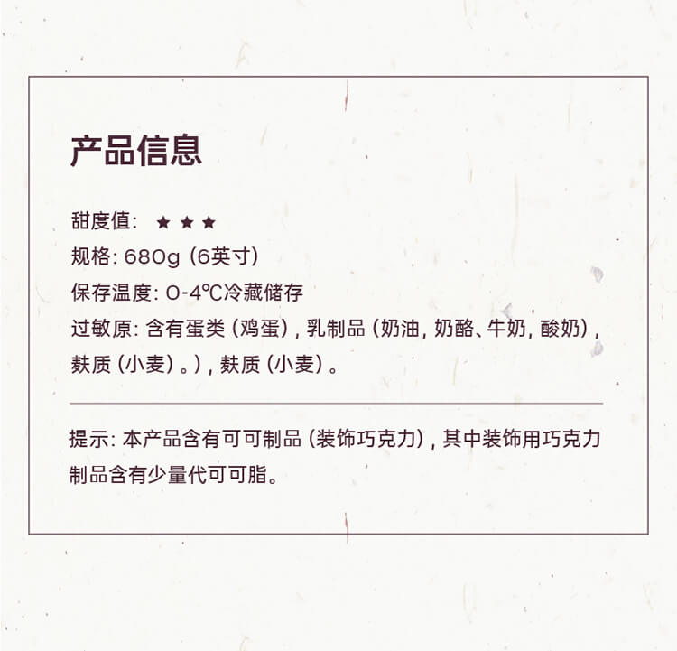 含有蛋类(鸡蛋),乳制品(奶油,奶酪、牛奶,酸奶),麸质(小麦)。 提示:本产品含有可可制品(装饰巧克力),其中装饰用巧克力制品含有少量代可可脂。