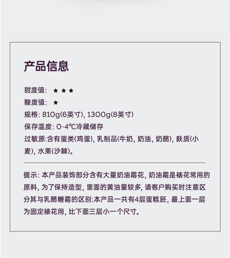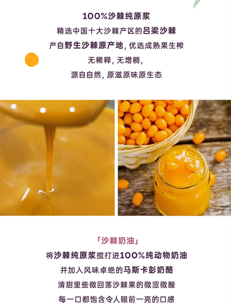 含有蛋类(鸡蛋),乳制品(牛奶,奶油,奶酪),麸质(小麦),水果(沙棘)