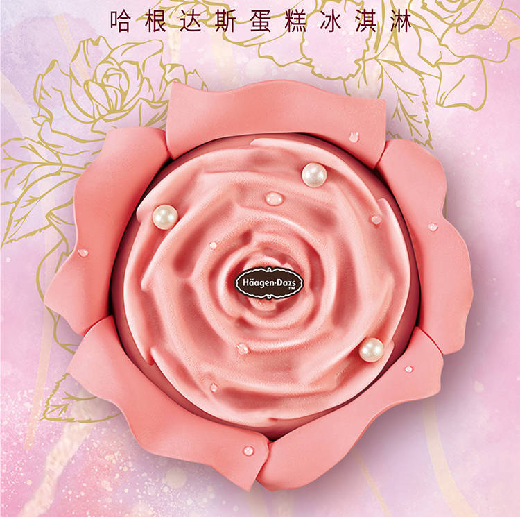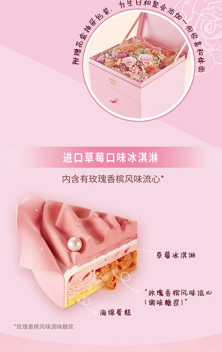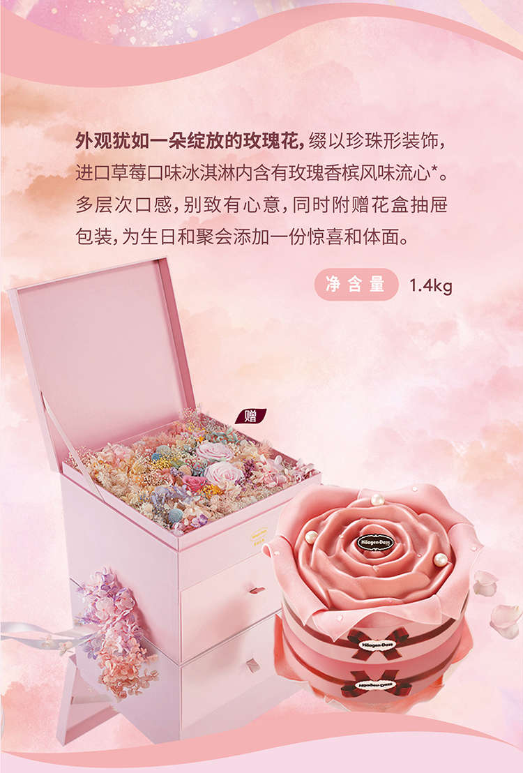 哈根达斯玫瑰之心蛋糕一次满足三种生日诉求:1.玫瑰外观独特玫瑰花造型,粉嫩精致。2.流心内涵 香槟玫瑰酒流心首创冰淇淋蛋糕流心。3.精致花盒,春日花盒可做收纳盒再利用