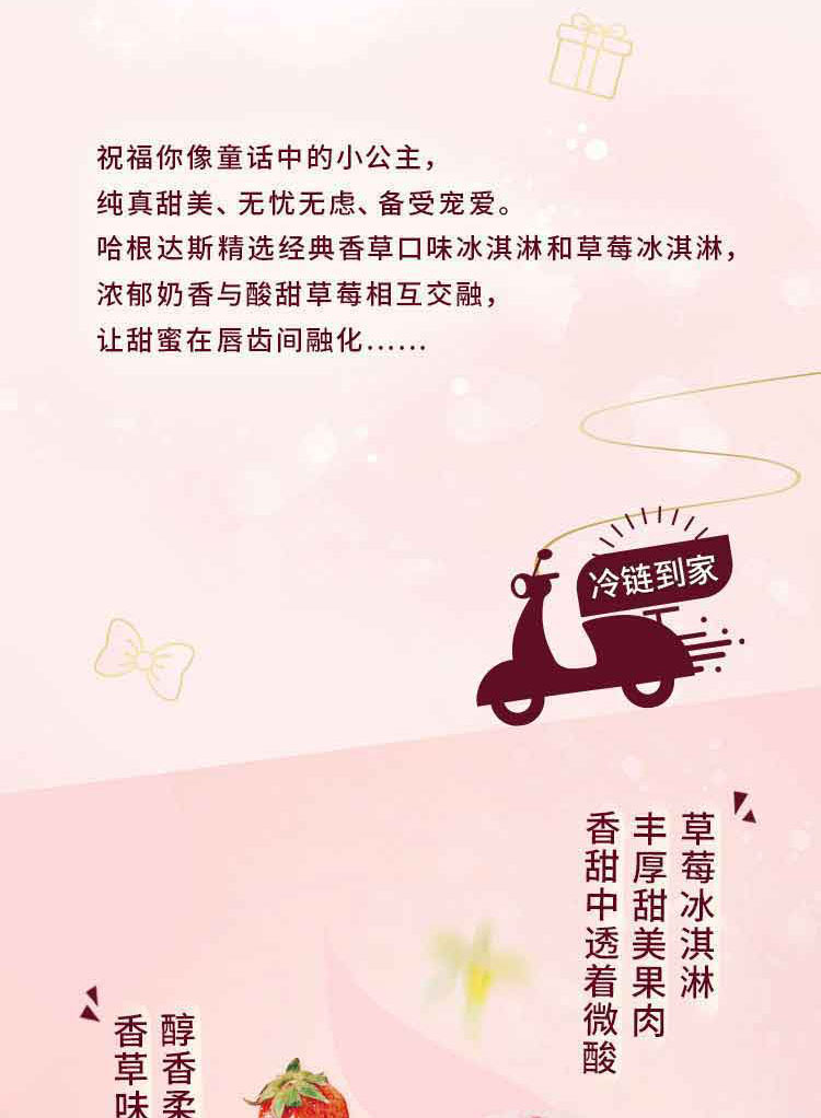 哈根达斯精选经典香草口味冰淇淋和草莓冰淇淋,浓郁奶香与酸甜草莓相互交融,让甜蜜在唇齿间融化,让快乐在笑靥中绽放,祝福你纯真快乐的小公主。