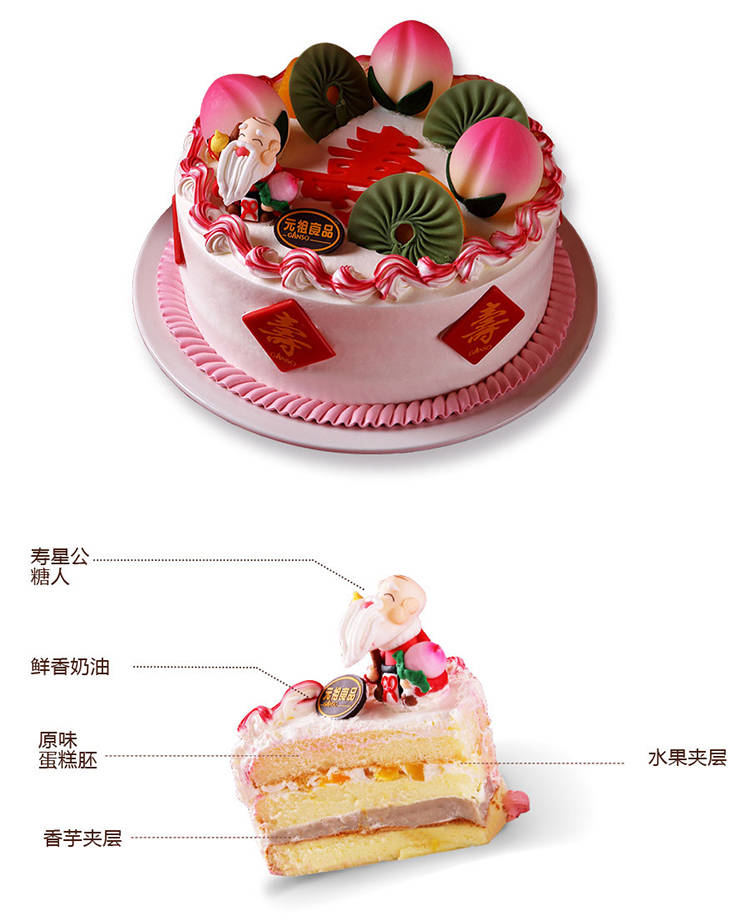 立减8元寿星公糖人、鲜香奶油、原味蛋糕胚,默认:水果+布丁夹层;如需改成其他夹层(巧克力脆片、芋泥奶油,可任选2种),请下单时备注或联系客服修改