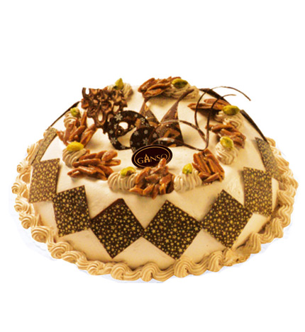 巧克力片围编,香脆美味的杏仁条、开心果上缀在鲜奶裱花。适合与绿茶、可乐等饮料搭配食用。