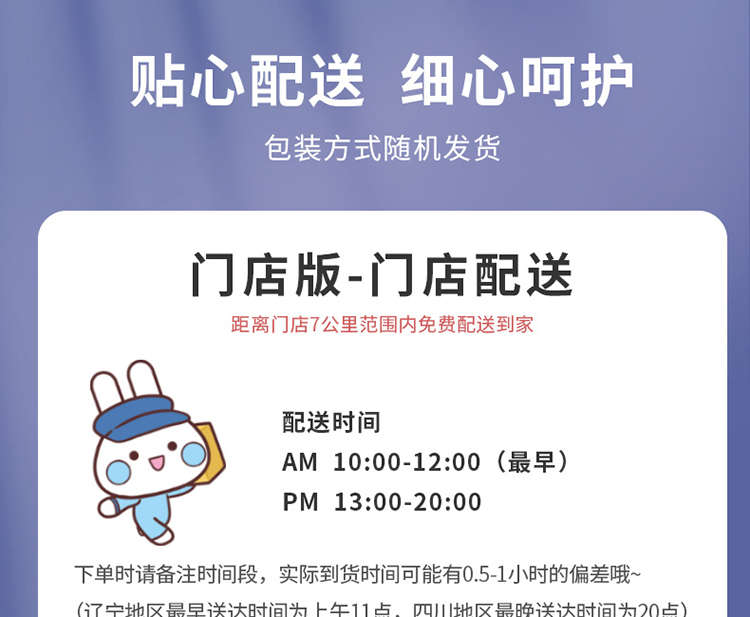 提交订单时您可以选择上午(8:30-12:00)、下午(12:00-18:00)、晚上(18:00-21:00)三个时段;如果对配送时间点有特别需求,您可以选择定时服务。特别提示:如果下单时间距离所选时段少于3小时,您所选时段无法满足的情况下,将尽量在您付款后3小时内送到。