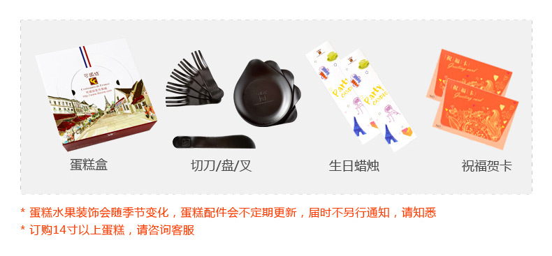 精致蛋糕盒包装,免费附送留言贺卡、一次性蛋糕用品一套
