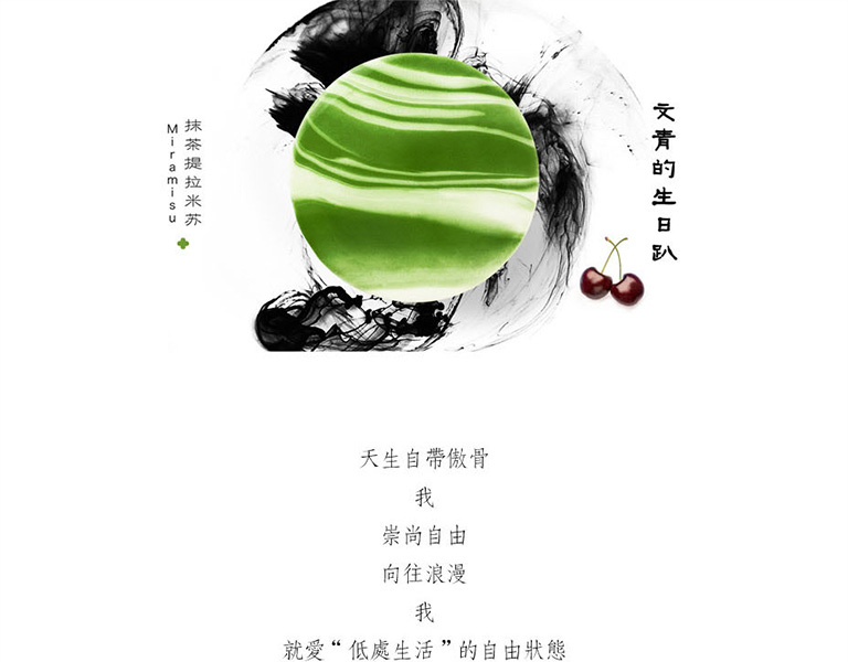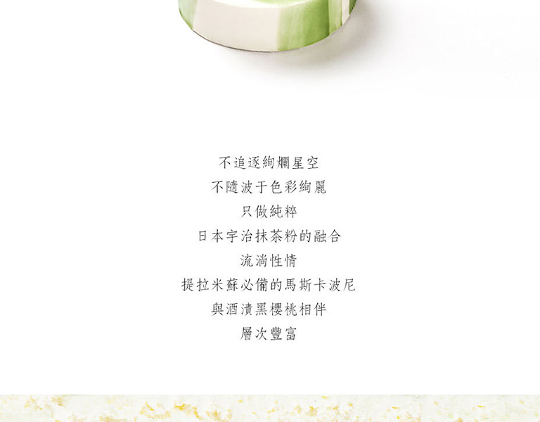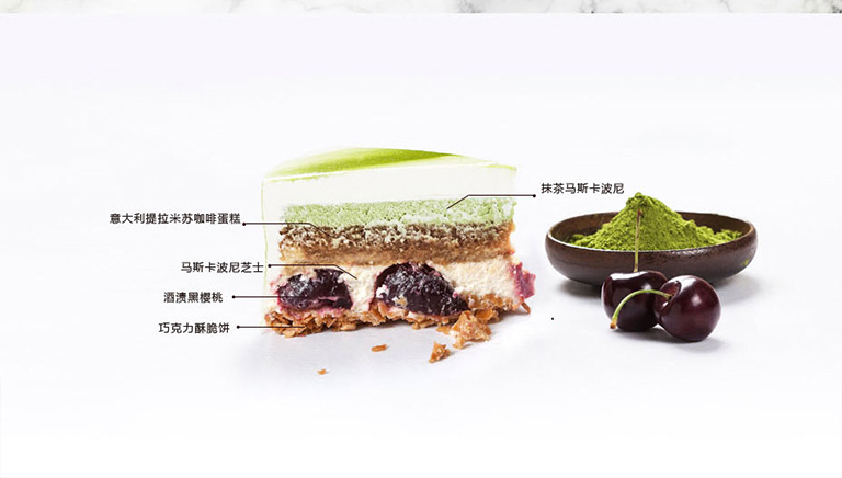乳脂奶油(新西兰)、马斯卡波尼芝士(意大利)、抹茶粉(日本宇治)、酒渍黑樱桃、德青源全蛋液、韩国白砂糖