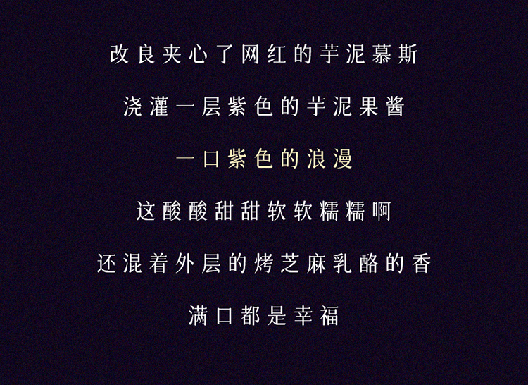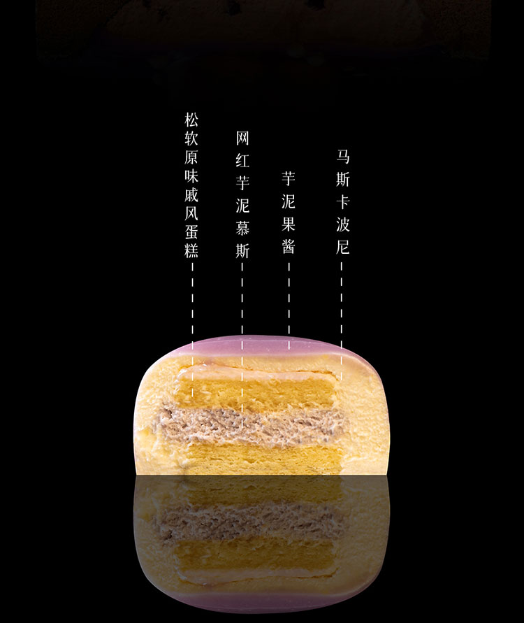 稀奶油 鸡蛋液 安佳奶油干酪 牛奶 镜面果胶 白砂糖 黑芝麻酱(黑芝麻)芋头粒酱罐头 小麦粉 饮用水 大豆油等
