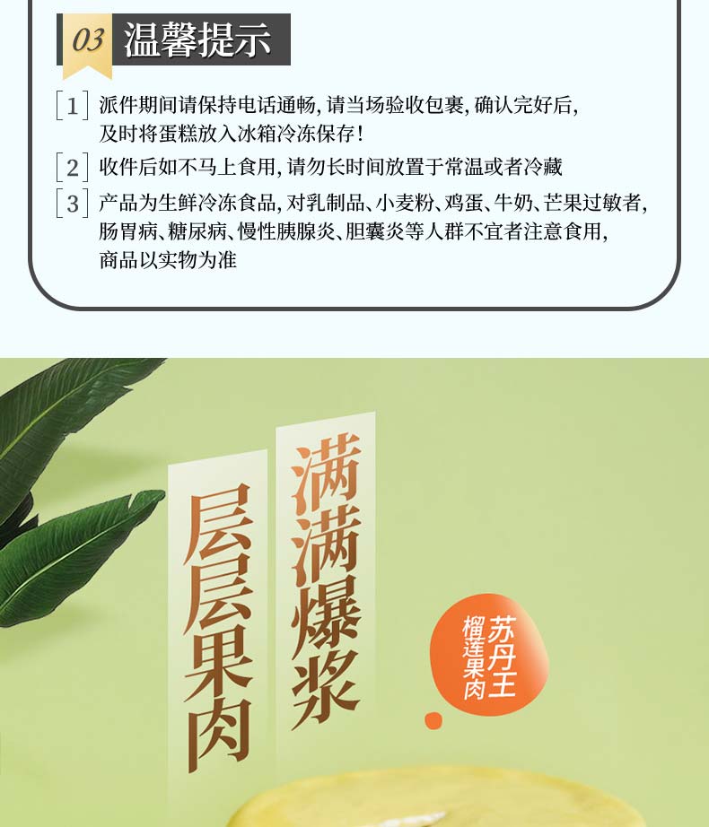 四季榴莲蛋糕通过顺丰冷链配送,不能承诺具体送达时段,您所选时段仅供发货参考,我们将尽量让送达时间吻合。