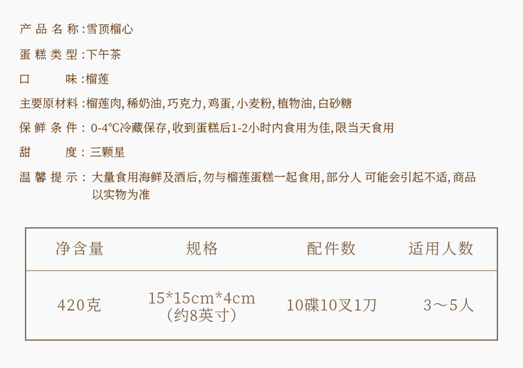 榴莲肉,稀奶油,巧克力,鸡蛋,小麦粉,植物油,白砂糖,食用盐。