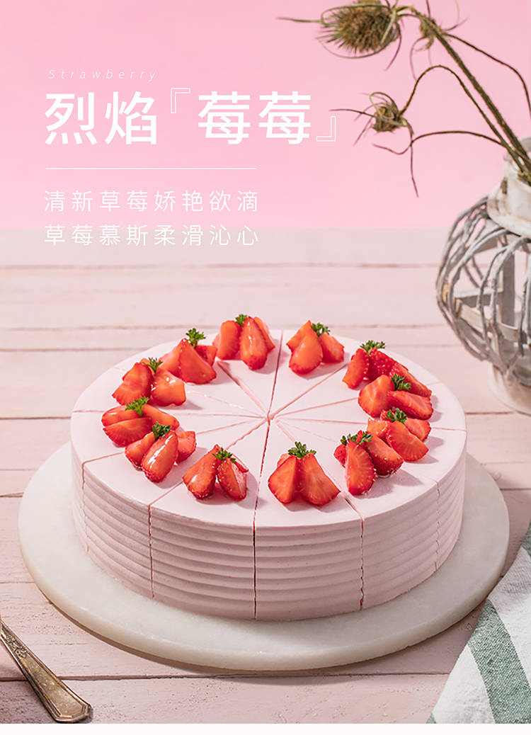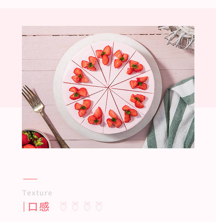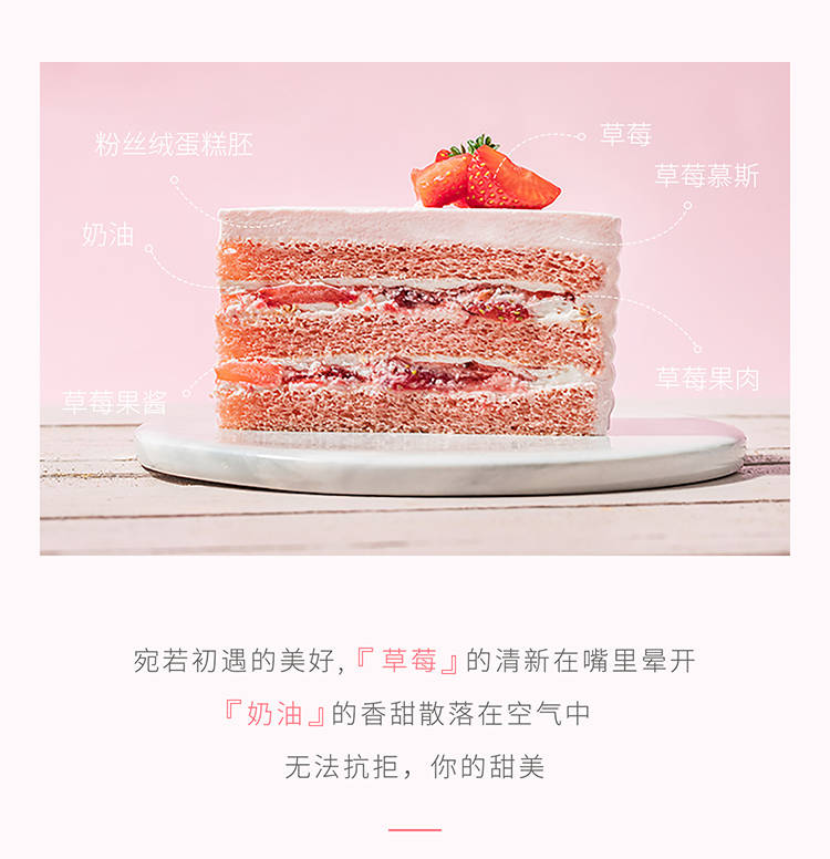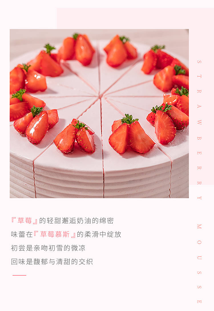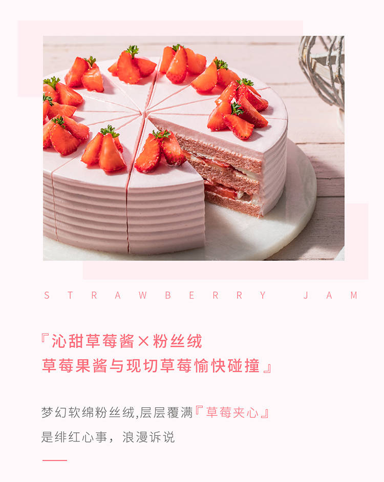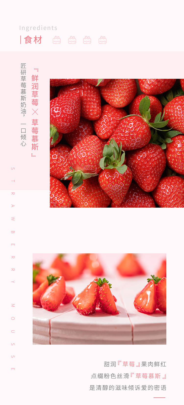 草莓,草莓慕斯、草莓果肉、草莓果酱、奶油、粉丝绒蛋糕胚