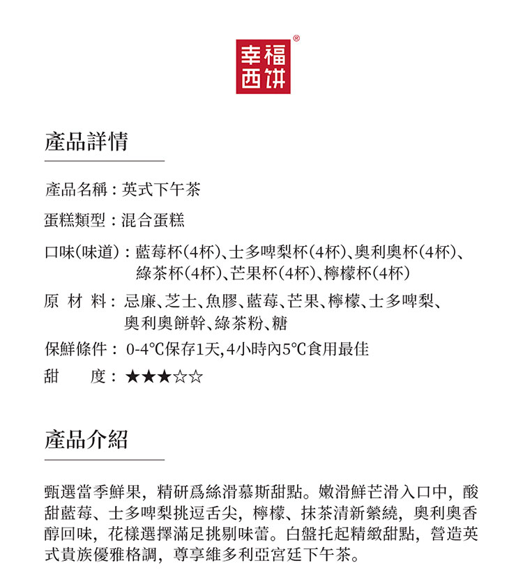 立减8元稀奶油,鸡蛋,巧克力,纯牛奶,小麦粉,蓝莓果酱,樱桃果酱,芒果,饼干,柠檬,果味酱,植物油,芒果果酱,干酪,白砂糖,风味酸牛乳,红豆馅料,植脂奶油(含乳脂类),调制炼乳,代可可脂巧克力,力娇酒(配制酒),抹茶粉,食用玉米淀粉,朗姆酒,可可粉,水,食用葡萄糖,食用盐,食用明胶,蕃茜。