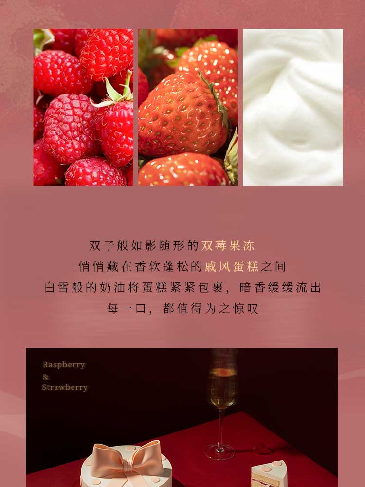 植脂奶油(含乳脂类),草莓,鸡蛋,代可可脂巧克力制品,小麦粉,树莓果酱,草莓果酱,饮用水,白砂糖,植物油,代可可脂巧克力,食用明胶,榛子巧克力酱(代可可脂),海藻糖,食用盐。