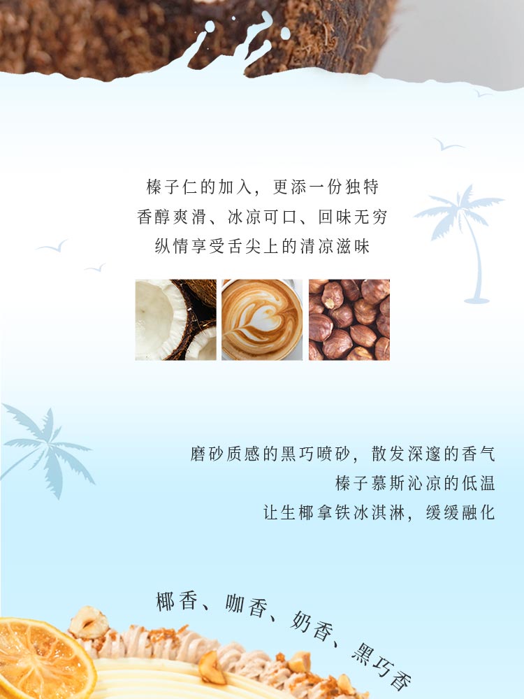 立减8元生椰拿铁风味冰淇淋(饮用水,白砂糖,麦芽糖浆,全脂乳粉,植物油,椰浆粉,奶油,脱脂乳粉,咖啡粉,麦芽糊精,食品用香精),稀奶油,巧克力,白砂糖,榛子仁,鸡蛋,柠檬,可可脂,椰子果酱,椰子浆,植物油,小麦粉,饮用水,纯牛奶,力娇酒(配制酒),食用明胶,饼干,海藻糖,代可可脂巧克力,榛子巧克力酱(代可可脂),食用盐。