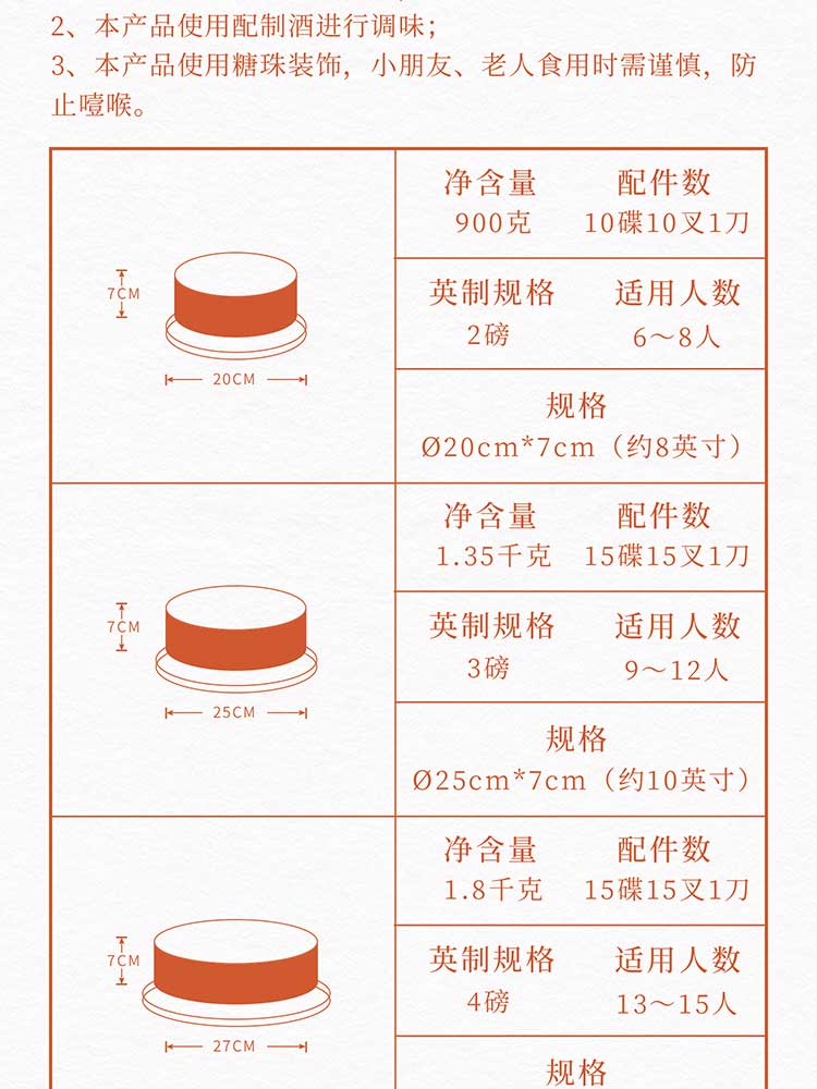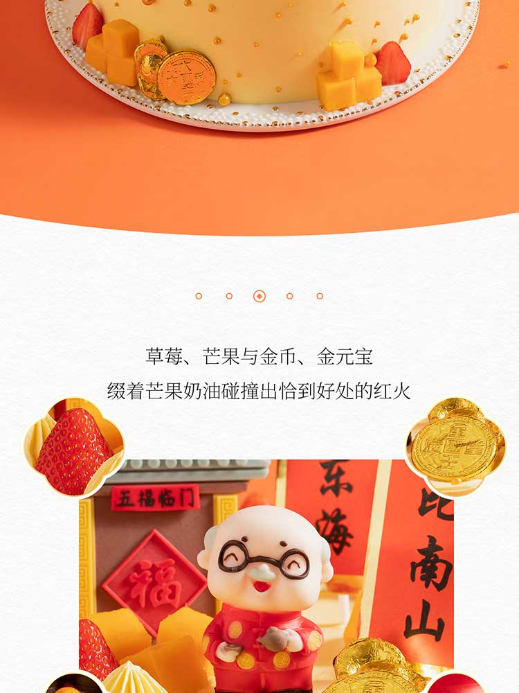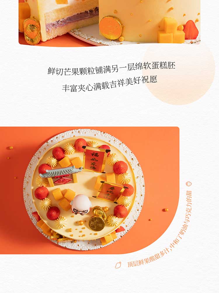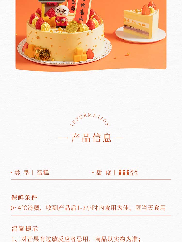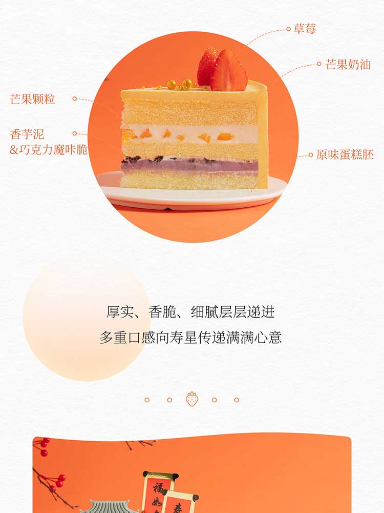 芒果,鸡蛋,草莓,植脂奶油(含乳脂类),小麦粉,饮用水,白砂糖,代可可脂巧克力,植物油,寿星婆(硬质糖果),寿星公(硬质糖果),海藻糖,草莓味果酱,果味酱,榛子巧克力酱(代可可脂),食用盐。