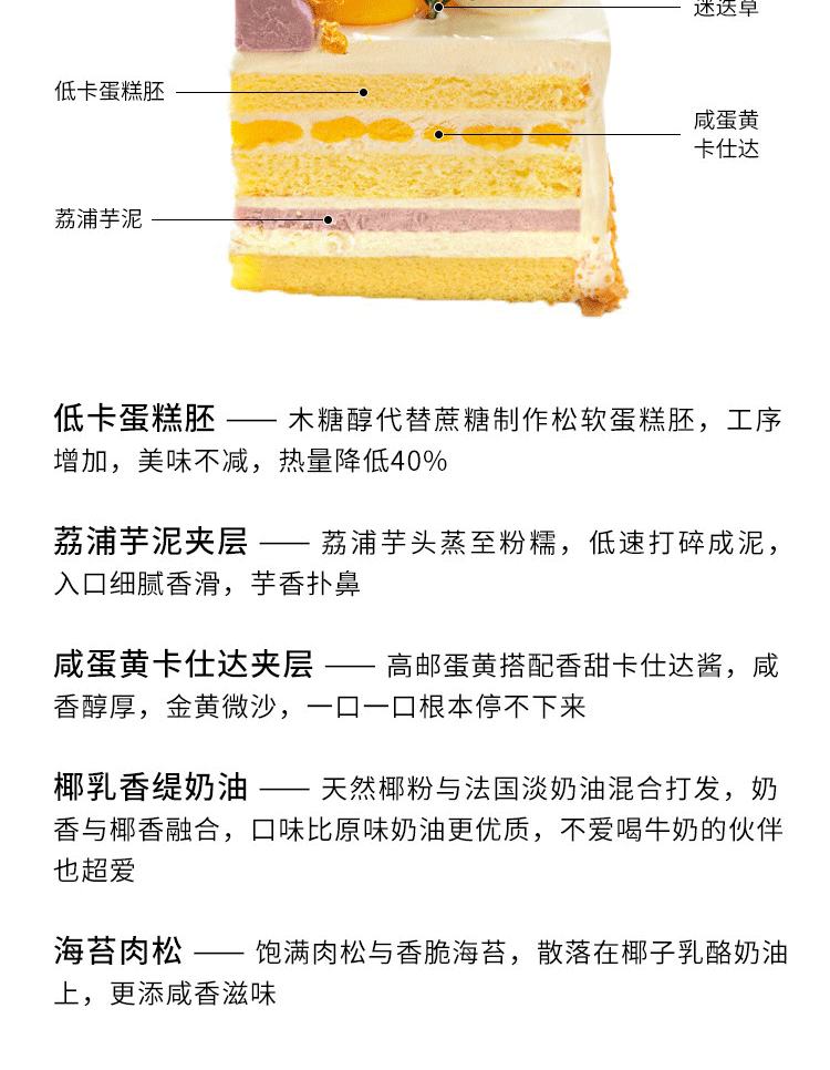 鸡蛋、牛奶、白砂糖、荔浦芋泥、咸蛋黄卡仕达、海苔肉松、椰子乳酪奶油