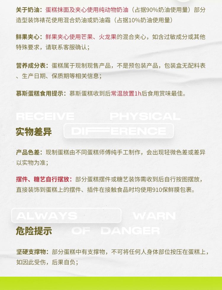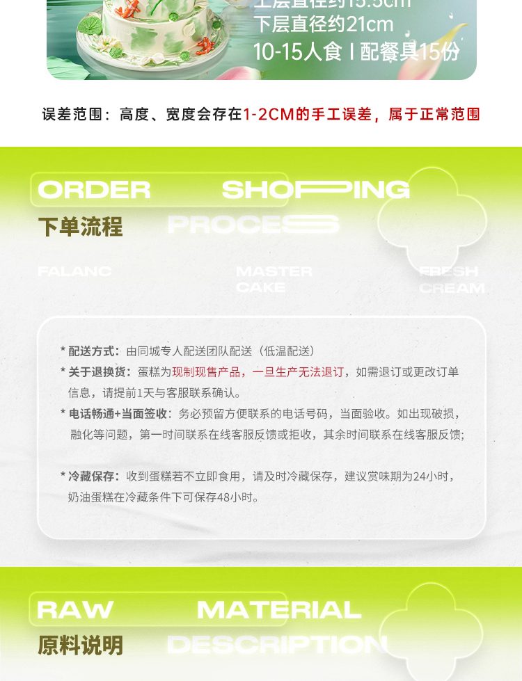 鲜花蛋糕都是配送当日新鲜材料制作而成,确保新鲜度,敬请放心订购!
