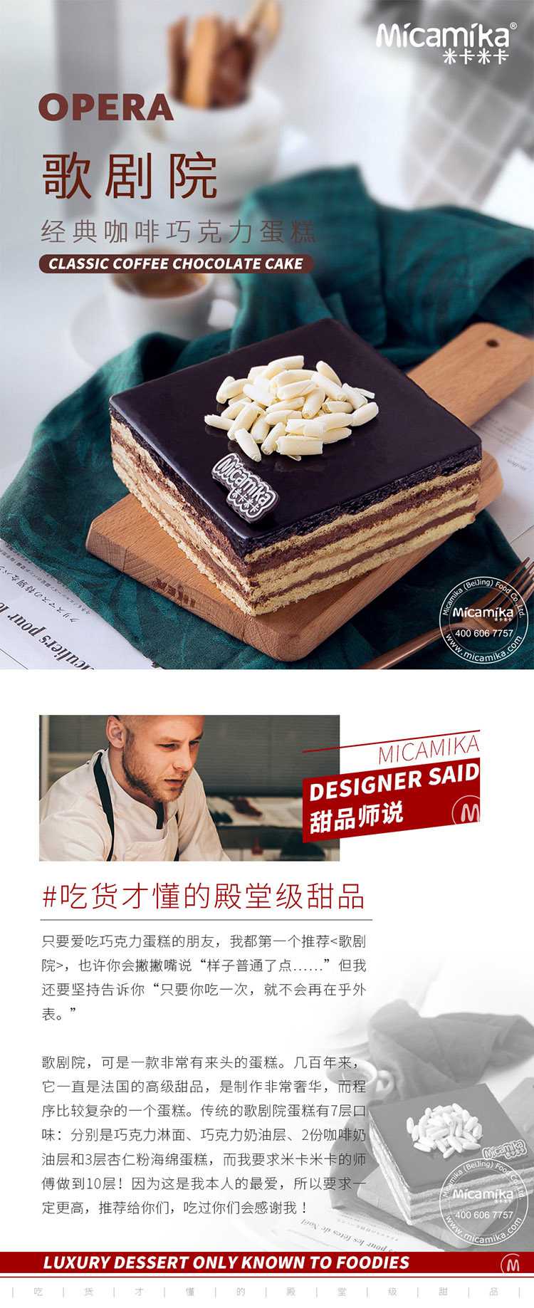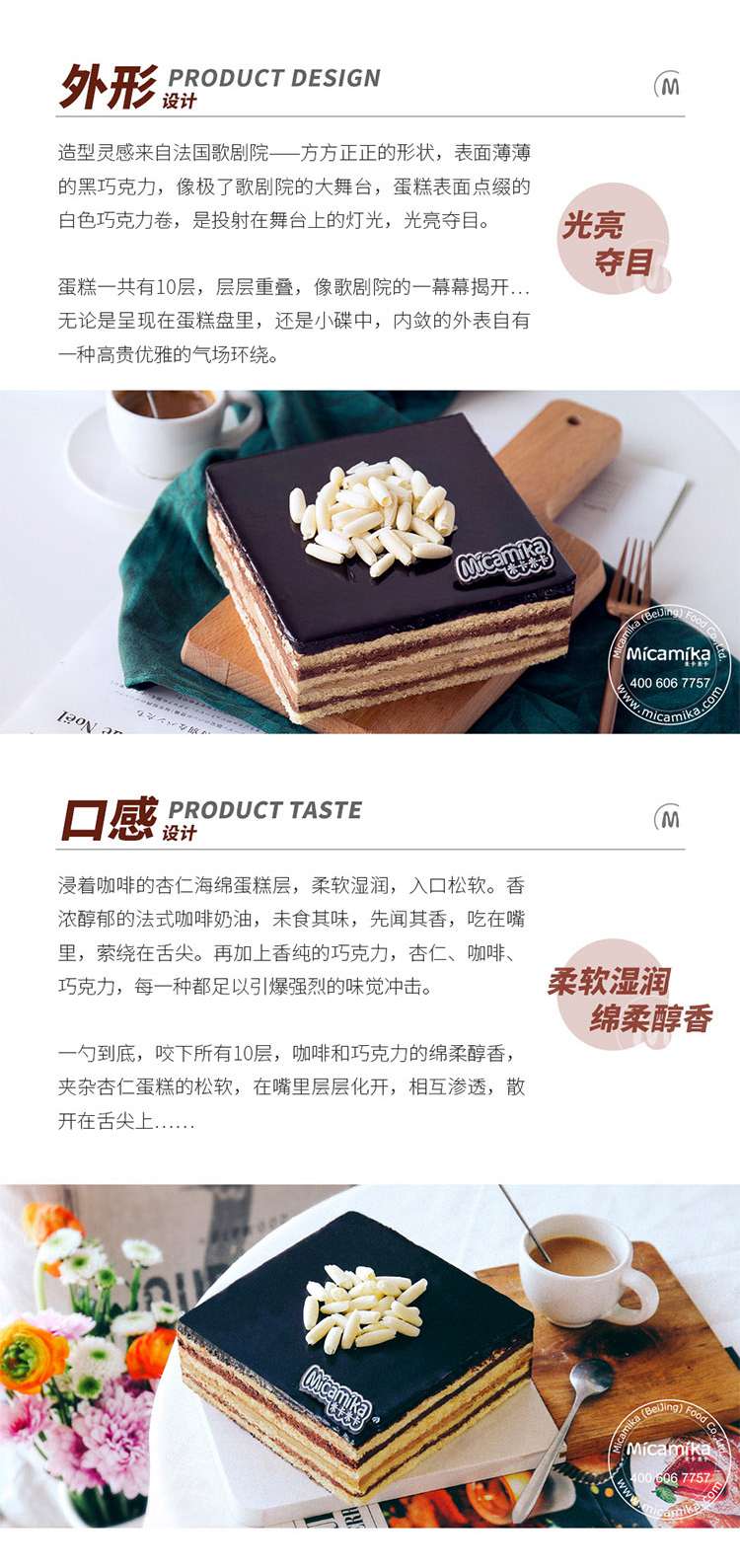 口味:浓郁的巧克力与咖啡令每个爱她们的人都迷恋不已。传统的欧培拉共有六层,包括三层浸过咖啡糖浆的海绵蛋糕,配以牛油、鲜奶油和巧克力奶油,整个蛋糕充满了咖啡与巧克力的香味,入口即化。
