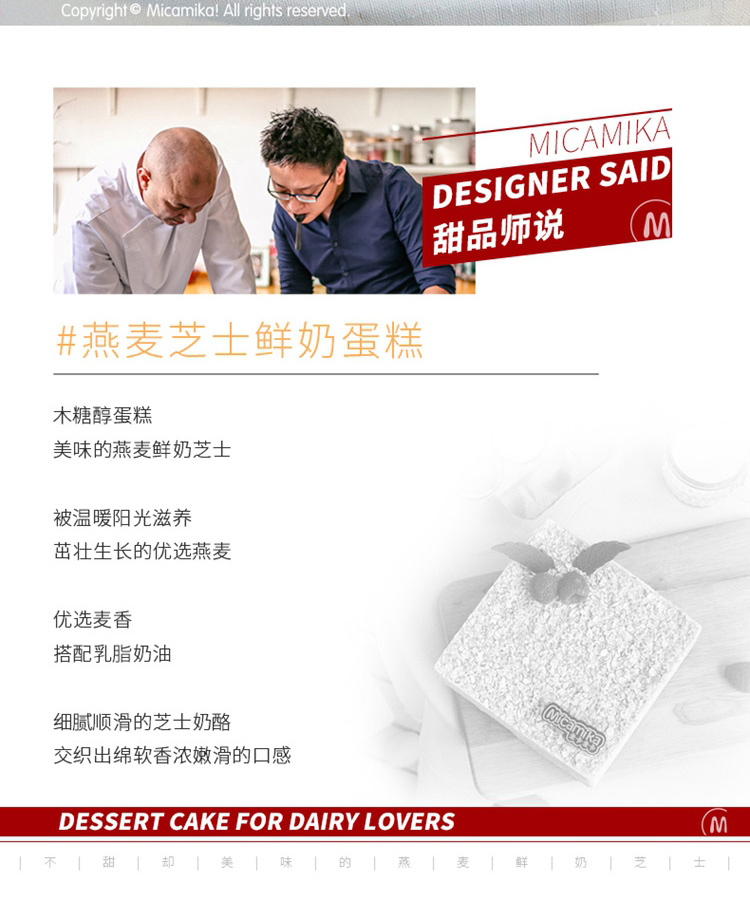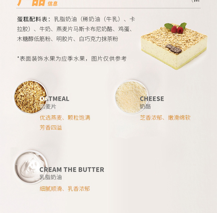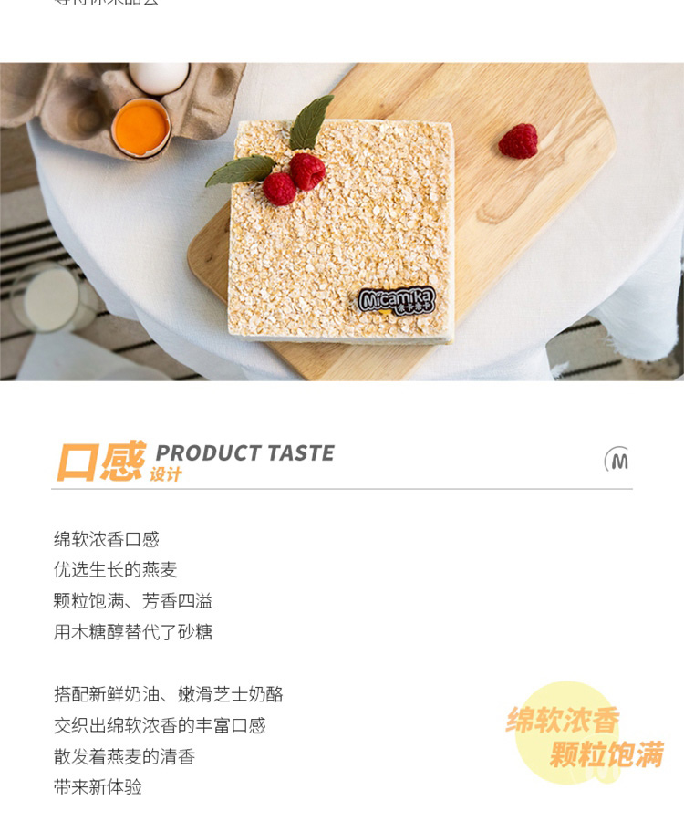 口味:浓香燕麦混合细腻奶油、嫩滑芝士,交织出绵软浓香的丰富口感。