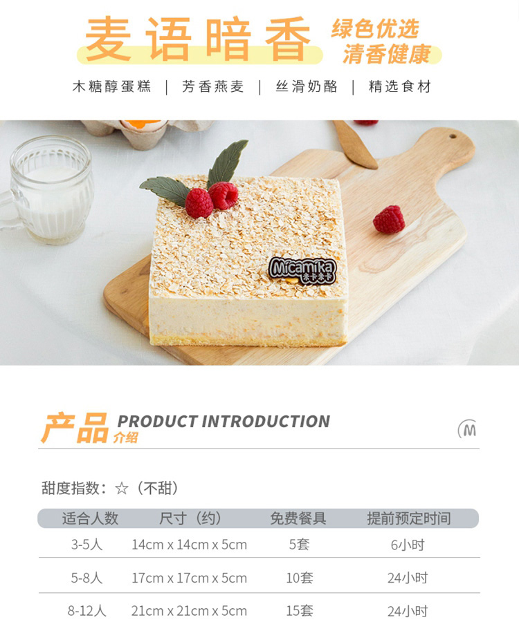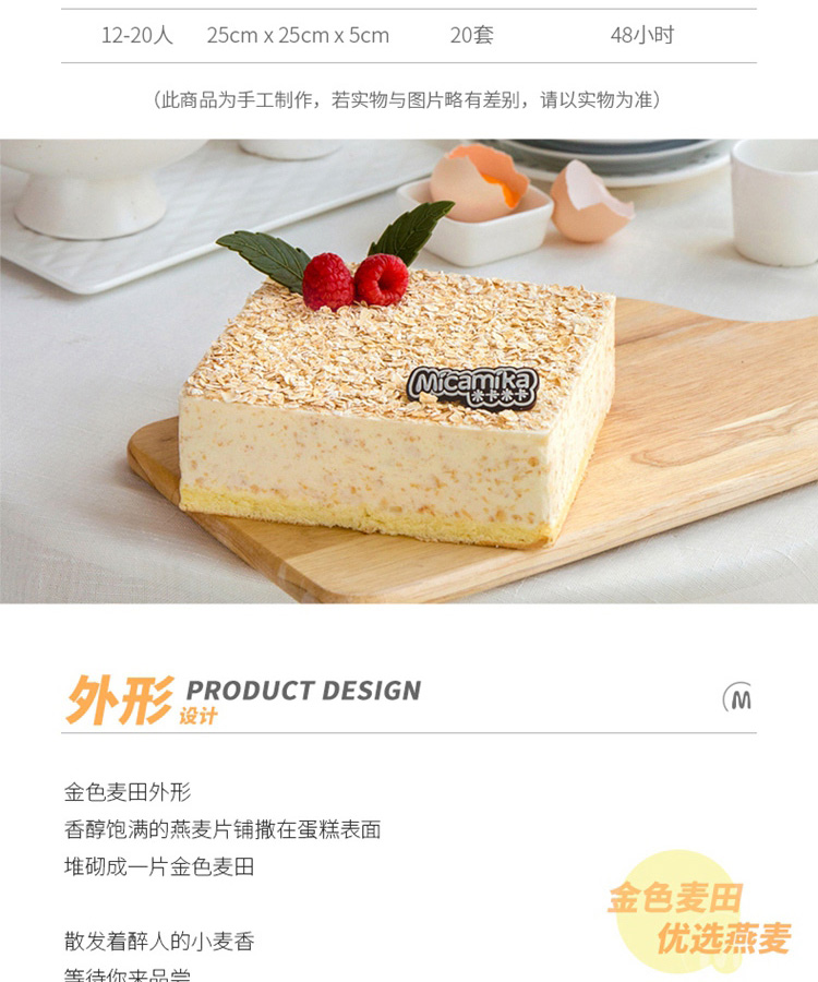 设计理念:设计理念来自于散发着成熟麦香的金色麦田。香醇饱满的燕麦片铺撒在蛋糕表面,堆砌成一片金色麦田,散发着醉人的小麦香,等待你的收获品尝。细腻香甜的奶油、嫩滑爽口的芝士,是滋养了小麦的肥沃土地。整个蛋糕没有多余的装饰,以新鲜采摘的时令水果和翠绿的抹茶巧克力叶子予以点缀,清新、悦目,忍不住要咬一口!