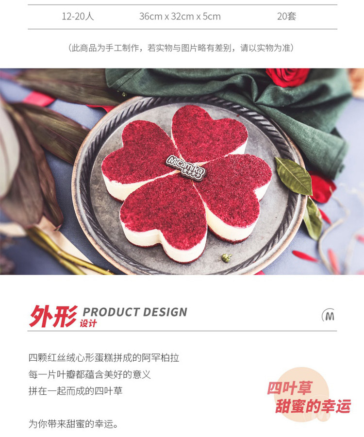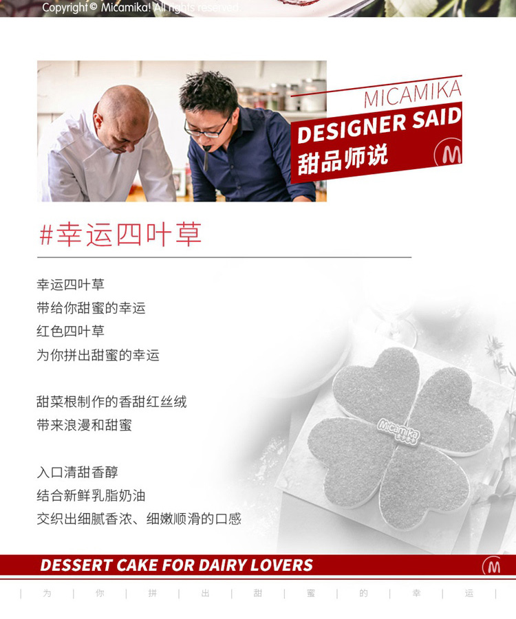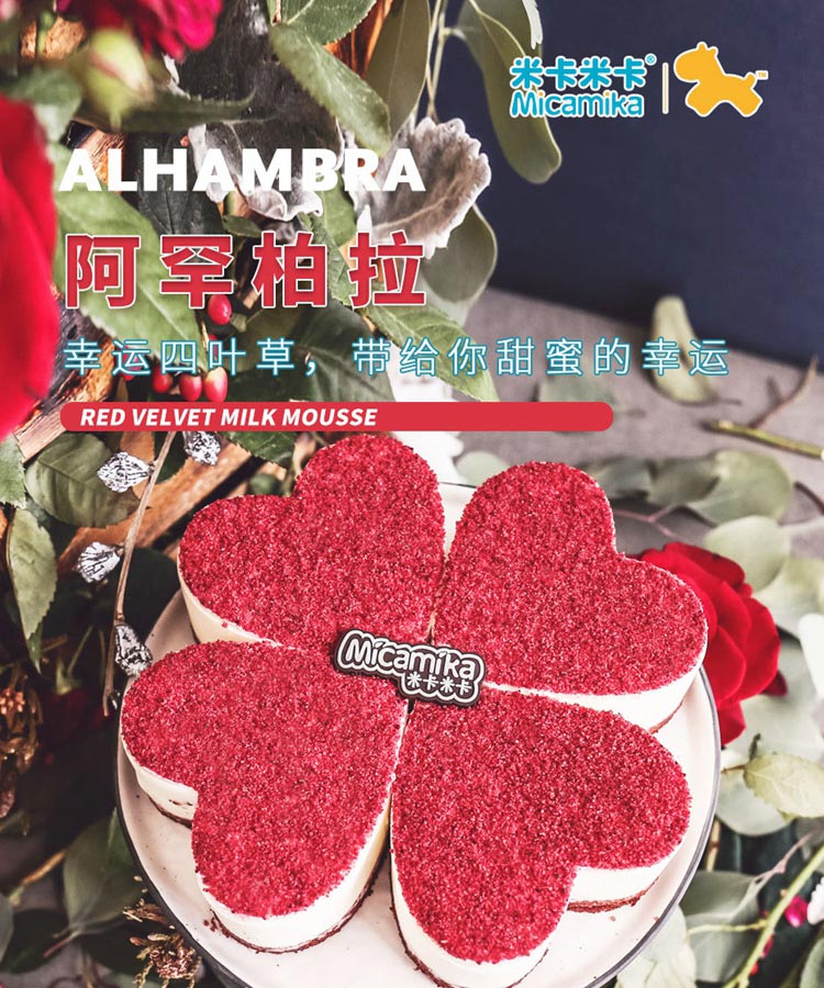 在上帝的宠爱中诞生的阿罕柏拉,采用西班牙红丝绒和新西兰鲜奶油创造而成,绽放出丝滑甜蜜口感,完美诠释了四叶草的含义。品尝它,可以享受到被幸福与温馨充满的滋味,为品尝者带来浪漫的恋情和甜蜜的幸运。