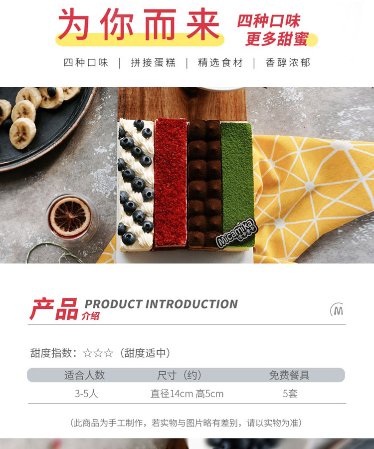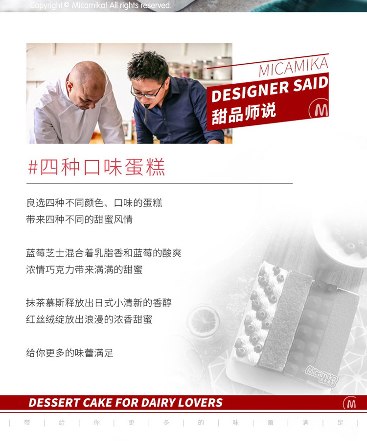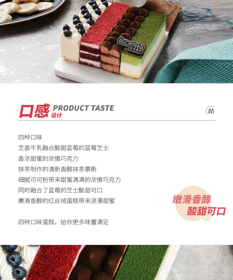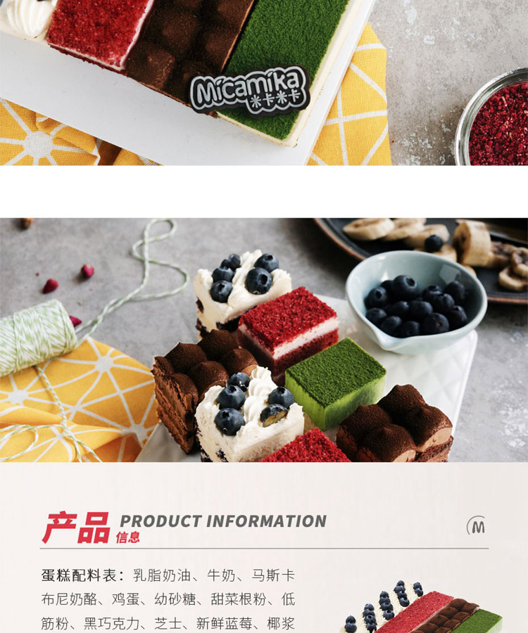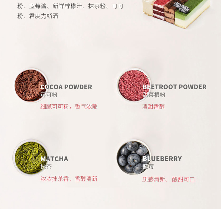 立减8元抹茶(日本)、可可粉(法国)、甜菜根粉(西班牙)、椰浆粉(泰国)、乳脂奶油(新西兰)、芝士(澳大利亚)、蓝莓(美国)、Mascarpone cheese(意大利)、低筋粉(丹麦)、鸡蛋(中国)、幼砂糖(韩国)