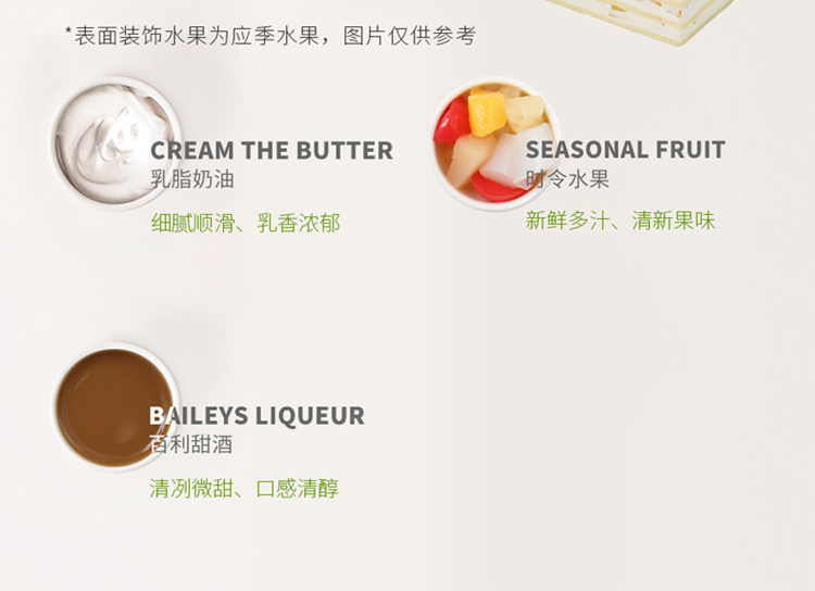 立减8元时令水果(菲律宾)、火龙果(巴西)、青提(美国)、小红提(美国)、蓝莓(美国)、乳脂奶油(新西兰)、君度力娇酒(法国)、百利甜酒(爱尔兰)、低筋粉(丹麦)、鸡蛋(中国)、幼砂糖(韩国)