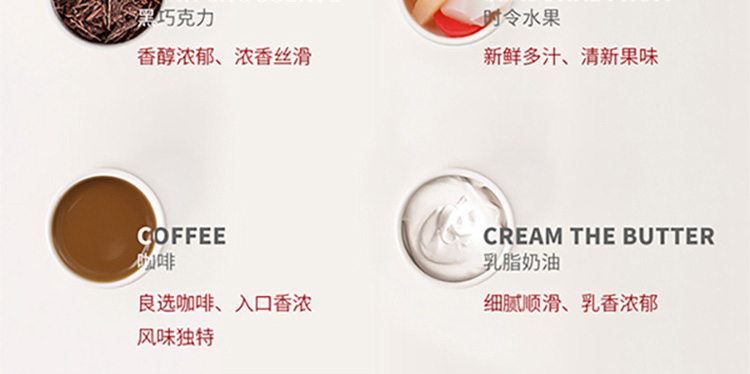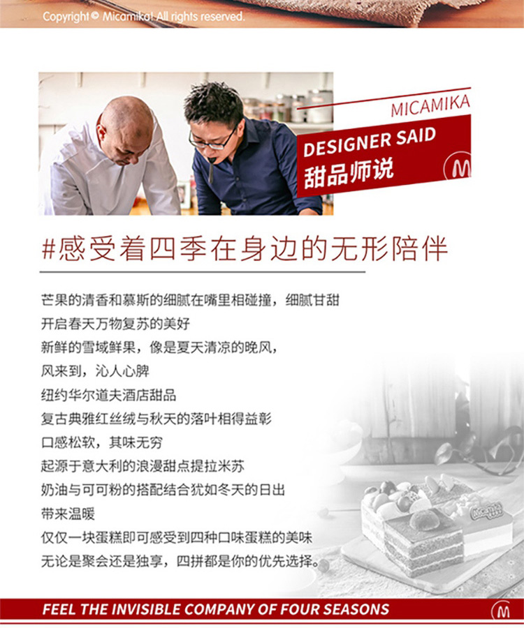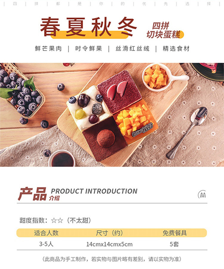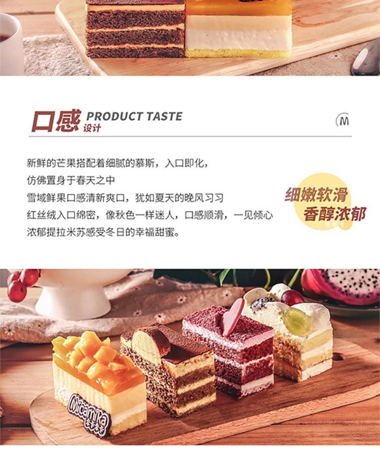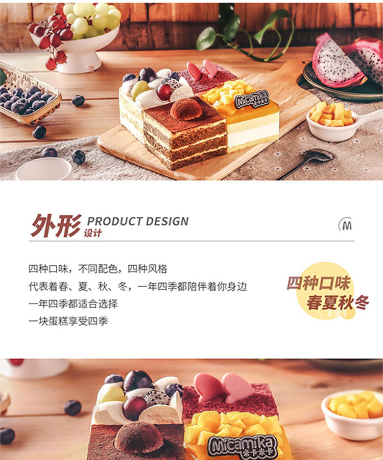 四种口味,不同配色,四种风格,代表着春、夏、秋、冬,一年四季都陪伴着你身边;一年四季都适合选择,一块蛋糕应有尽有!