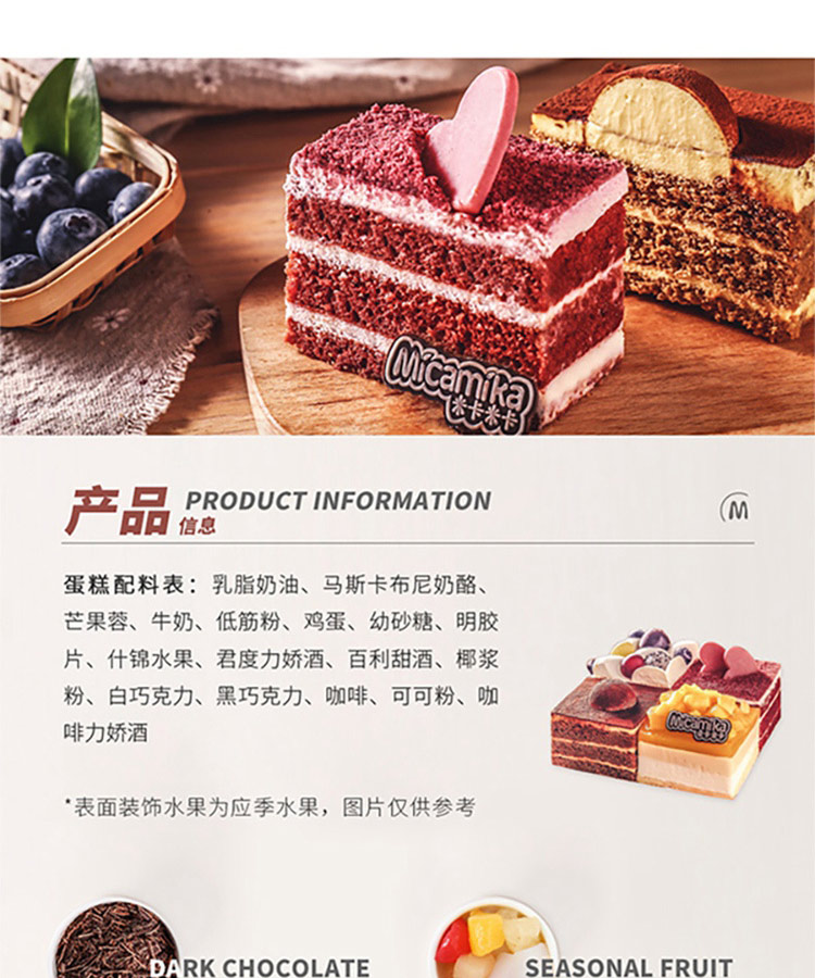 立减8元马斯卡布尼奶酪(意大利)、乳脂奶油(新西兰)、芒果蓉(澳洲)、牛奶(新西兰)、低筋粉(丹麦)、鸡蛋(中国)、幼砂糖(韩国)、时令水果、君度力娇酒(法国)、百利甜酒(爱尔兰)、椰浆粉(泰国)、白巧克力(比利时)、黑巧克力(比利时)、咖啡(意大利)、可可粉(法国)、咖啡力娇酒(墨西哥)
