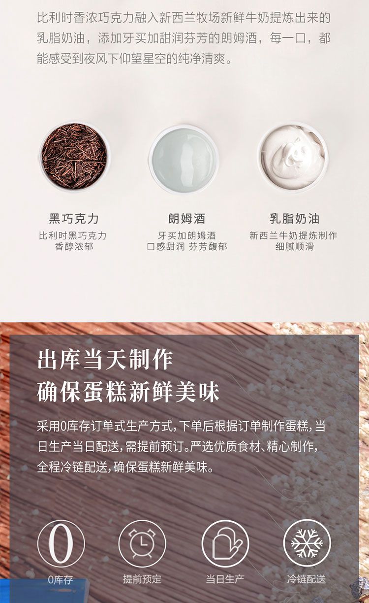 乳脂奶油(新西兰)、黑巧克力(比利时)、朗姆酒(牙买加)、幼砂糖(韩国)