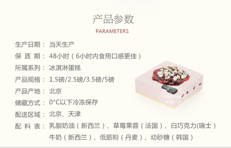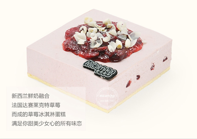配 料 表:乳脂奶油(新西兰)、草莓果蓉(法国)、白巧克力(瑞士)、牛奶(新西兰)、低筋粉(丹麦)、鸡蛋(中国)、幼砂糖(韩国)