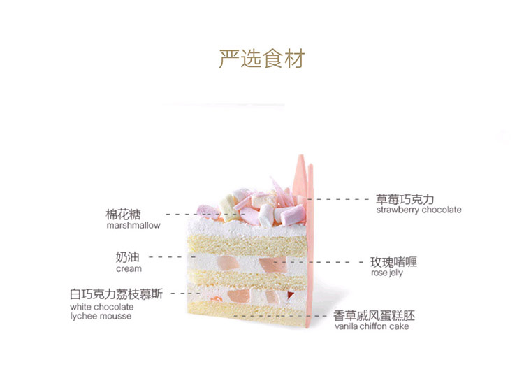 配料: 白巧克力荔枝慕斯、香草味戚风蛋糕胚、奶油、棉花糖、巧克力、玫瑰味啫喱