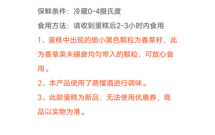 温馨提示:蛋糕中出现的细小黑色颗粒为香草籽,此为香草荚未碾磨均匀带入的颗粒,可放心食用。