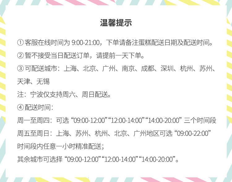 3.提前订好,我们会记住您选择的配送日期,按指定日期准时送达,即使忙碌,也保证您不会错过任何一个重要的日子!