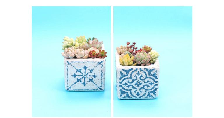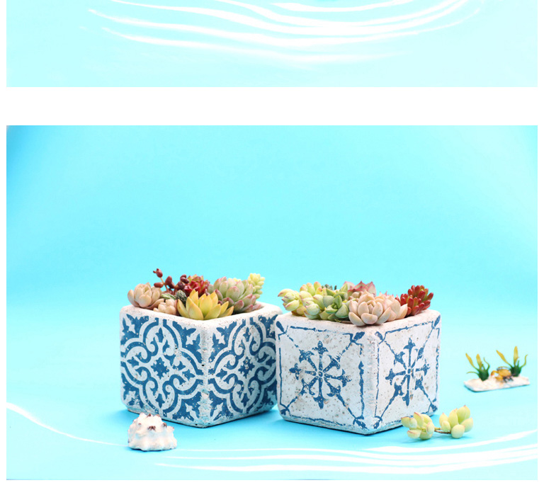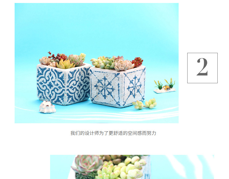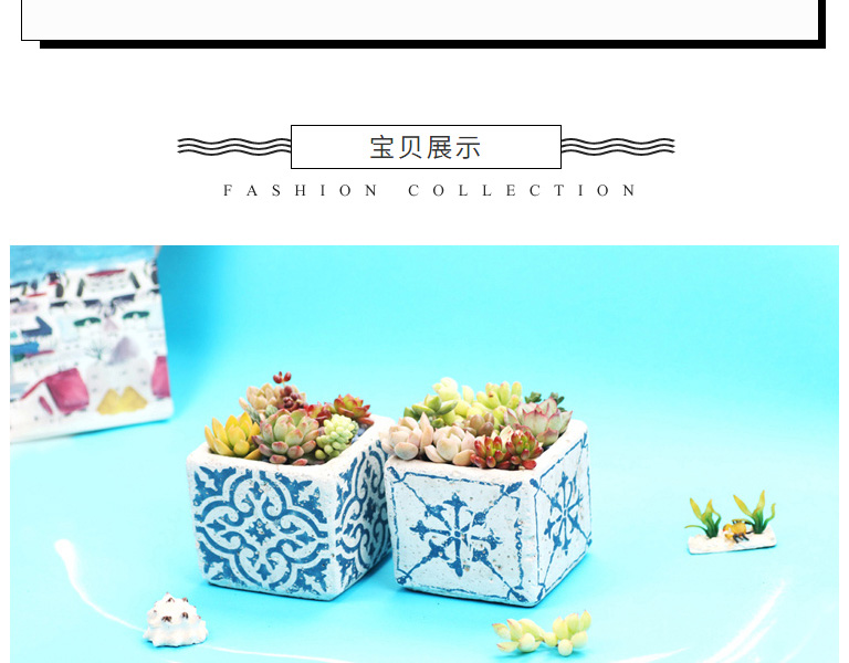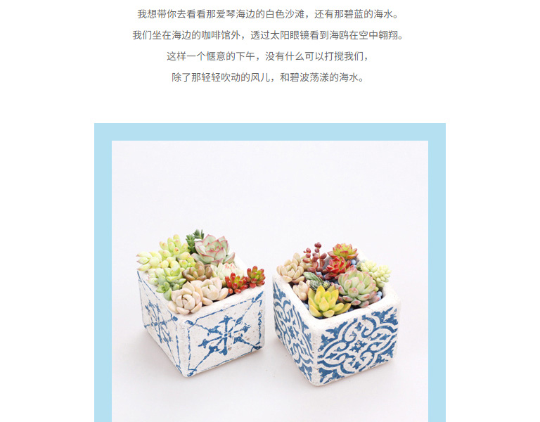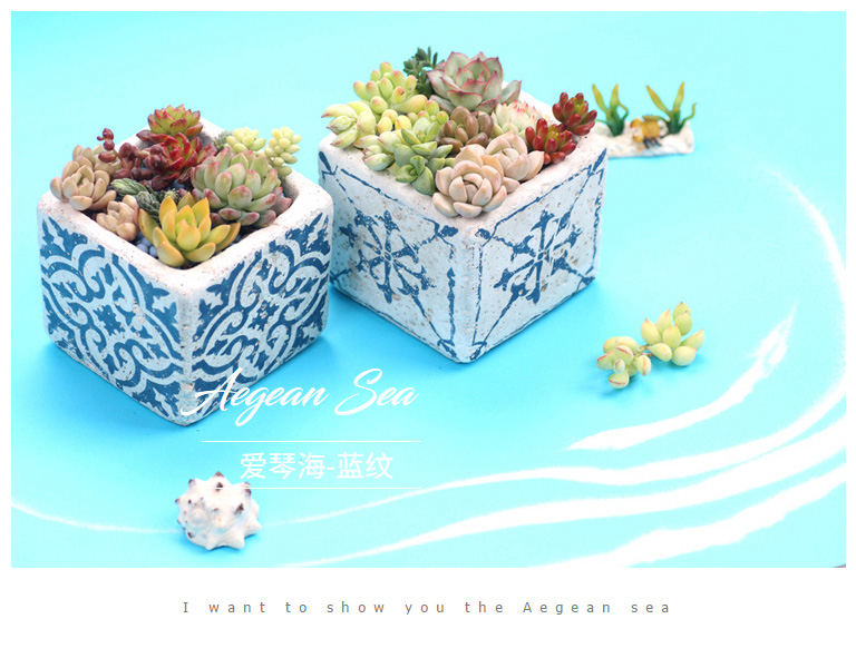手绘陶质花盆*2 白底蓝色花纹 陶质