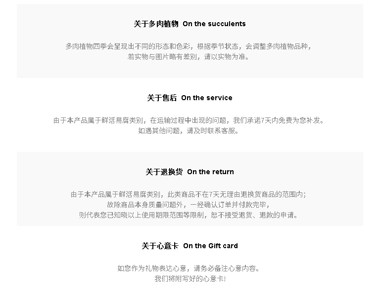 我们一直致力于持续提升服务水平,追求零客诉,我们为客户提供完善的售后服务。如果出现误单、花材不符、贺卡有误或者其他任何您不满意的情况,欢迎您第一时间与我们联系,我们将尽快为您做出回复和处理。200%退赔承诺,即如果漏单未送,订单款项全额退还给您,原订单商品同时再免费配送一次, 详见售后服务条款>>