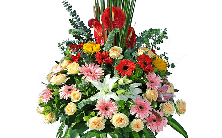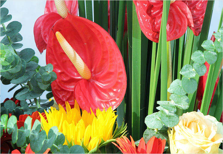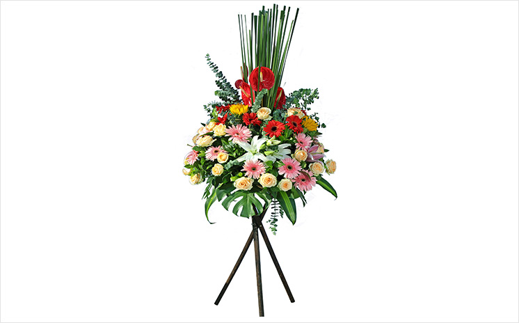 开业花篮: 红掌6枝,向日葵3枝,百合6朵,香槟玫瑰30枝,红色太阳花10枝,粉色太阳花15枝,水竹叶1扎,尤加利半扎 ,填充适量栀子叶、巴西叶、龟背,四面观花架