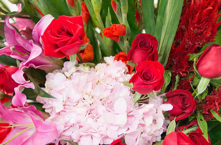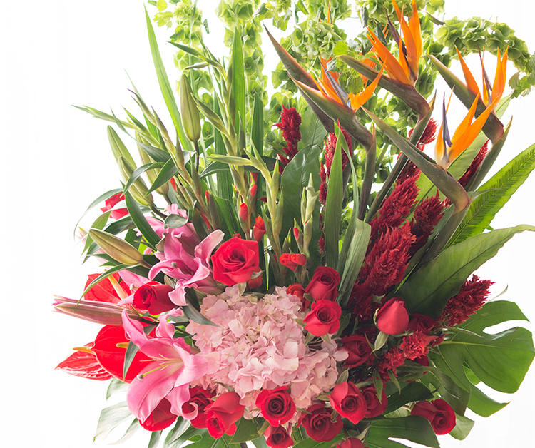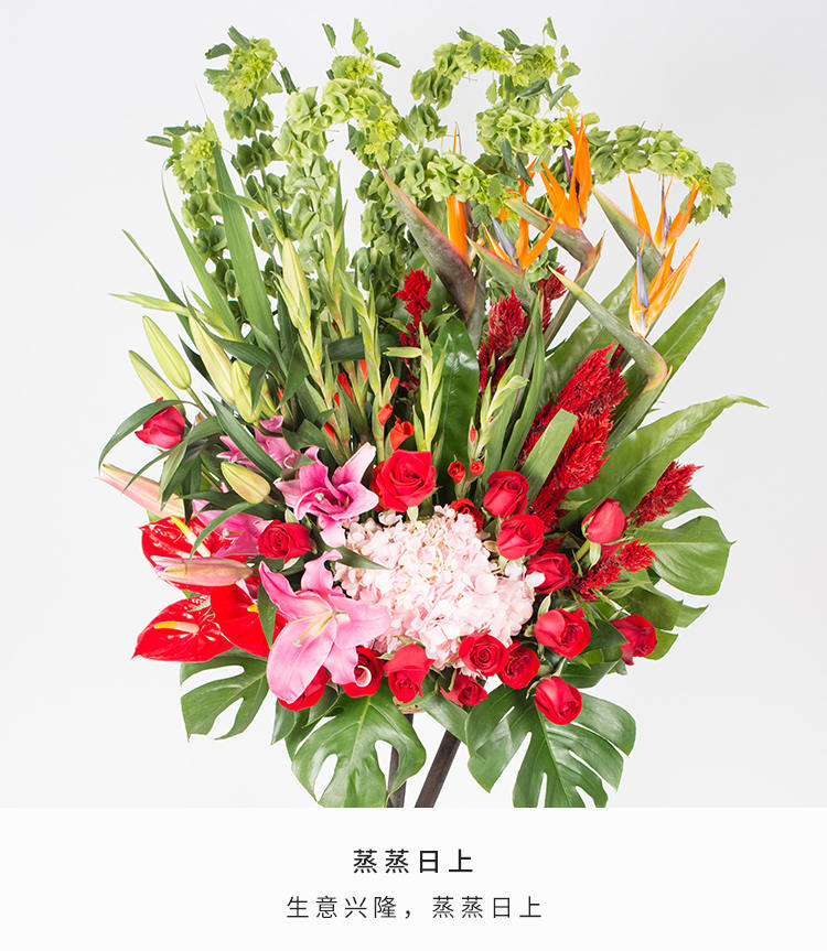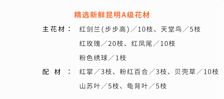 红剑兰(步步高)10枝,天堂鸟5枝,红玫瑰20枝,红凤尾10枝,粉色绣球1枝,红掌3枝,粉红百合3枝,贝壳草10枝,山苏叶5枝,龟背叶5枝