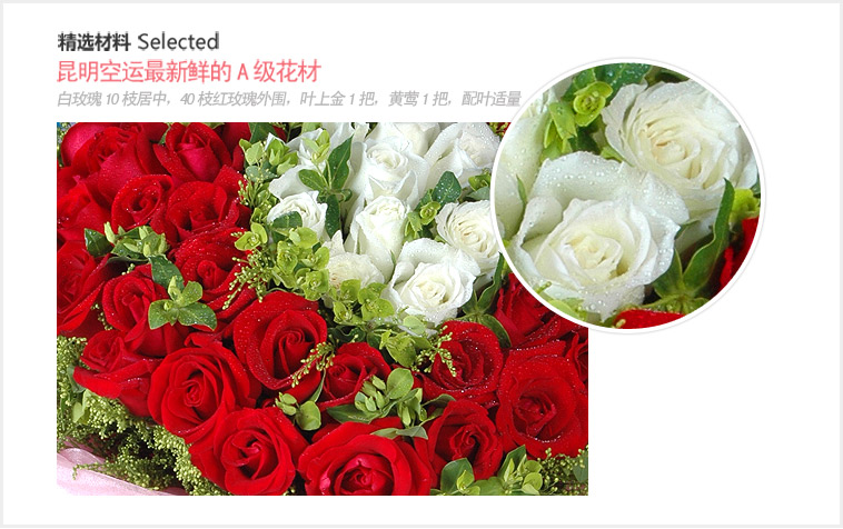 白玫瑰10枝居中,40枝红玫瑰外围,叶上金1把,黄莺1把,配叶适量