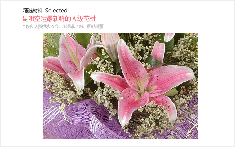 3枝多头粉香水百合,水晶草1把,配叶适量