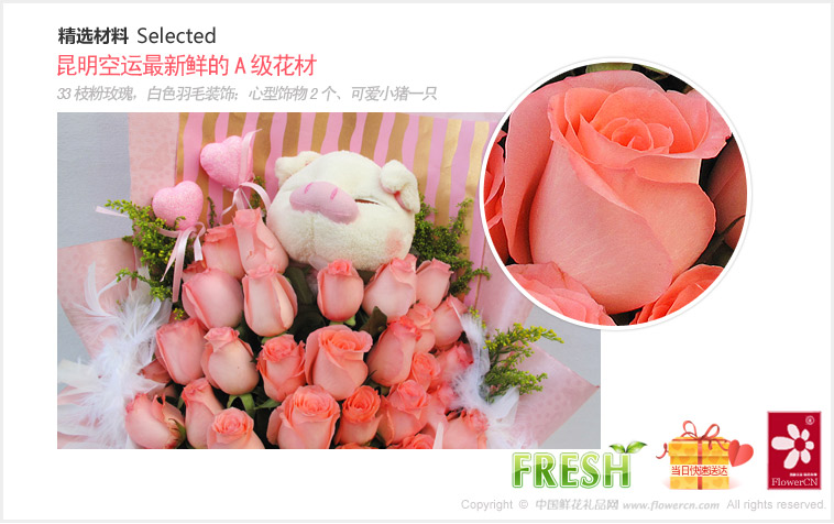 33枝粉玫瑰,白色羽毛装饰;心型饰物2个、可爱小猪一只(小猪高约16-18CM)