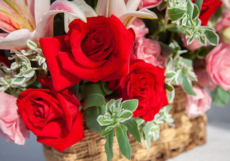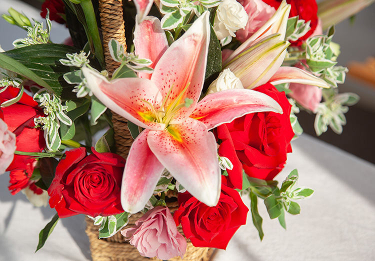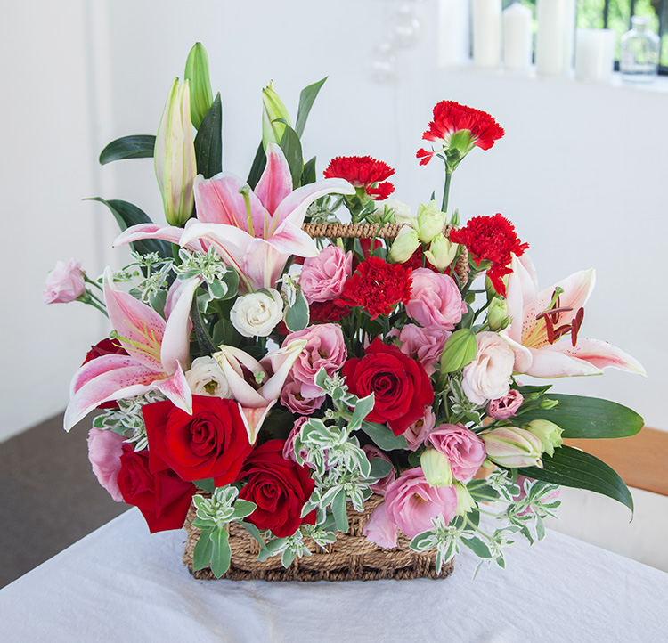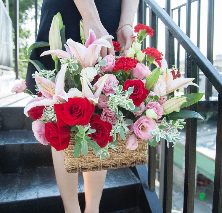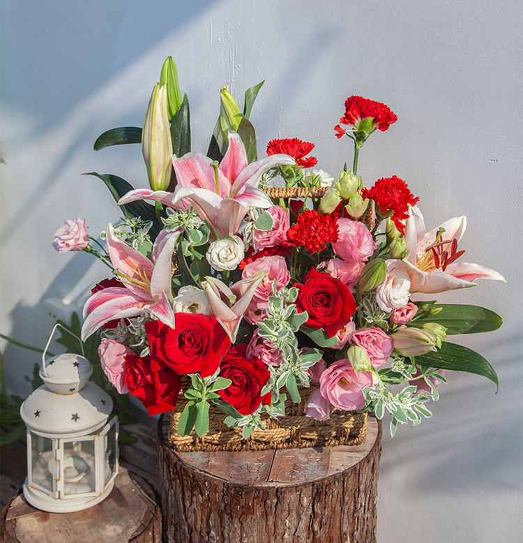 [花篮设计 送礼百搭] 粉百合2枝、卡罗拉红玫瑰9枝、红色康乃馨15枝