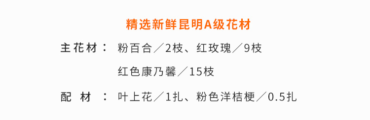 粉百合2枝(3-5头/支)、卡罗拉红玫瑰9枝、叶上花10枝、红色康乃馨15枝、粉色洋桔梗5枝(3头以上/支)