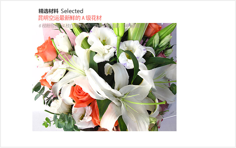 6枝粉玫瑰,3枝白香水百合,白色桔梗适量,绿叶点缀