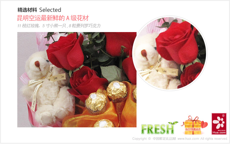 11枝红玫瑰,5寸小熊一只,8粒费列罗巧克力