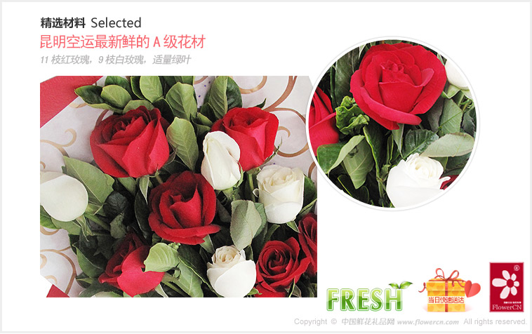 11朵红玫与白玫交错排列,时而热情如火,时而高贵典