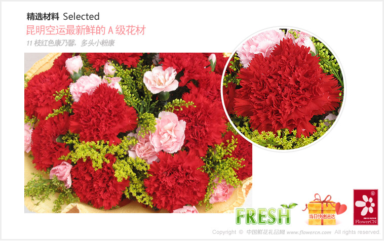 11枝红色康乃馨,多头小粉康(与红康数量相当,如当地无小粉康,将用红色或其他颜色康乃馨替代)搭配,黄莺丰满